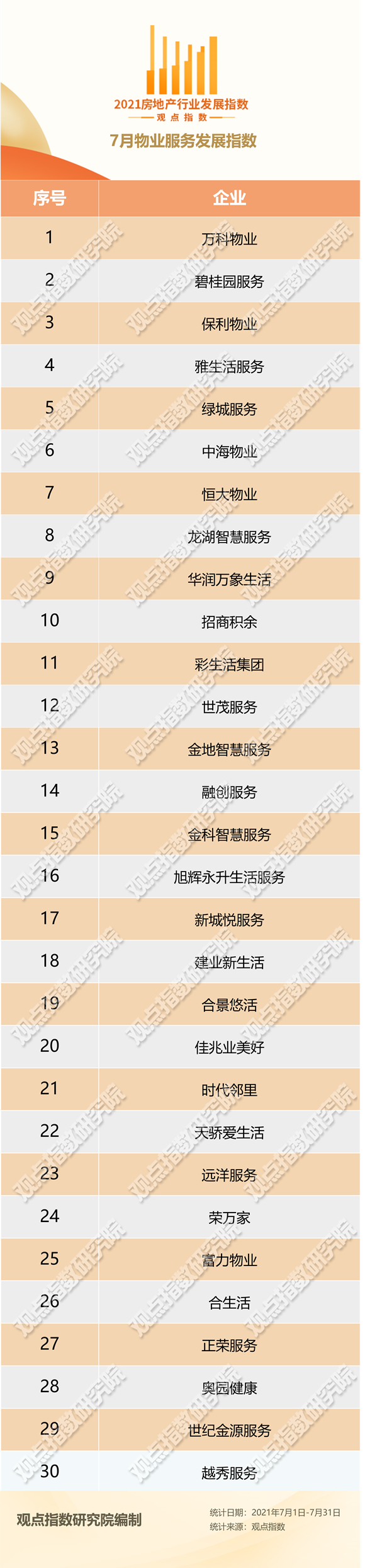 據(jù)觀點(diǎn)指數(shù)統(tǒng)計,7月累計跌幅最大的港股物業(yè)股分別為恒大物業(yè)、世茂服務(wù)以及綠城服務(wù),累計跌幅分別為43.4%,33.0%和29.9%。除此之外,碧桂園服務(wù)與融創(chuàng)服務(wù)也均錄得24.9%與27.2%的累計跌幅。