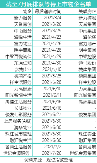 此外,魯商生活服務(wù)與世紀(jì)金源服務(wù)分別于7月2日及26日赴港遞交了招股書,其中后者為招股書過期后的二度遞表;截至7月底,港交所目前共有22家物企排隊等待上市,A股則僅有上房服務(wù)一家。