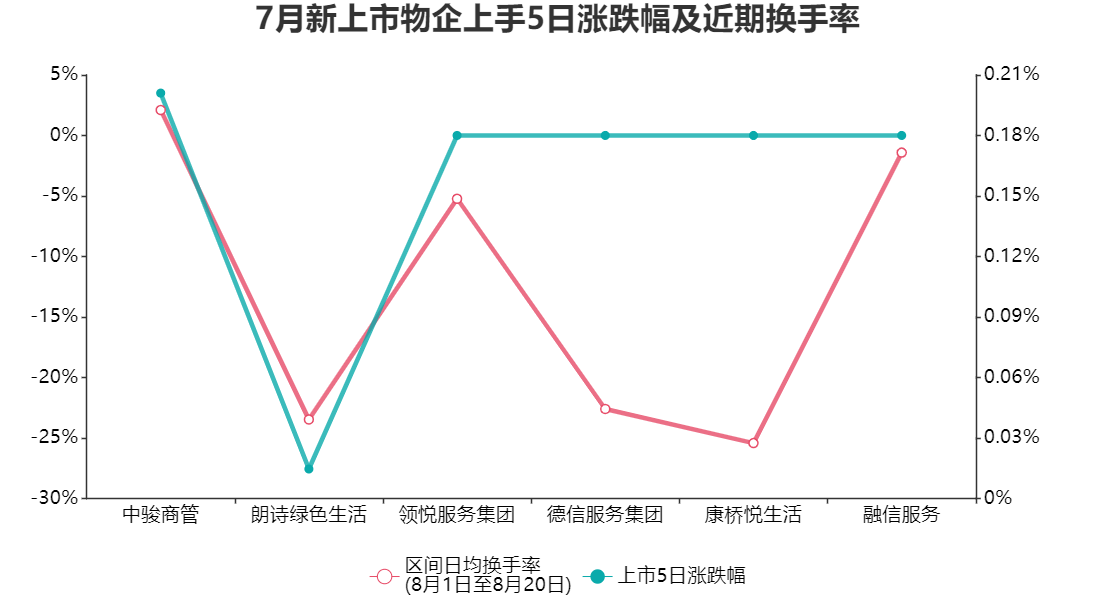 上市首5個交易日,除了朗詩綠色生活累計下跌27.6%,中駿商管累計上漲3.5%外,其余4只新上市物業(yè)股均穩(wěn)定于發(fā)行價。近期交易量也較為低迷,8月1日至8月20日的日均換手率的平均值僅為0.1%。