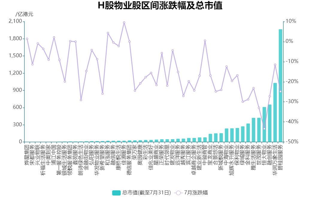 資本市場上,7月份H股物業(yè)股下挫明顯,僅佳源服務(wù)累計漲幅較高,為9.56%,大部分物業(yè)股包括龍頭在內(nèi)均有不同程度的下跌,市值蒸發(fā)逾千億。