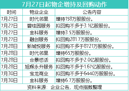 不過,本輪下跌過后,各物企也紛紛發(fā)布回購及管理層增持事宜公告,旨在重新提振股價。由于本次文件并未影響物業(yè)服務(wù)企業(yè)的基礎(chǔ)運(yùn)營根基和估值邏輯,在股份回購以及中報發(fā)布等一系列利好消息的刺激下,物業(yè)股股價應(yīng)會逐漸回調(diào)。