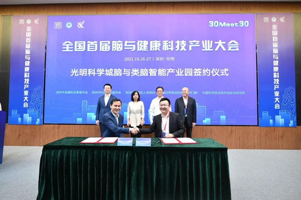 大會(huì)以“孕育未來(lái)生命科技新變革,搶占腦與健康產(chǎn)業(yè)制高點(diǎn)”為主題,進(jìn)一步挖掘光明區(qū)域產(chǎn)業(yè)與腦科學(xué)結(jié)合的未來(lái)潛力。大會(huì)當(dāng)天舉行了光明科學(xué)城腦與類腦智能產(chǎn)業(yè)園簽約儀式,招商局智慧城項(xiàng)目與中國(guó)科學(xué)院深圳先進(jìn)技術(shù)研究院腦認(rèn)知與腦疾病研究所(以下簡(jiǎn)稱“腦所”)簽訂了戰(zhàn)略合作協(xié)議。招商蛇口產(chǎn)業(yè)園區(qū)事業(yè)部副總經(jīng)理齊子元、腦所所長(zhǎng)王立平上臺(tái)簽約,深圳市、光明區(qū)、中國(guó)科學(xué)院深圳先進(jìn)技術(shù)研究院和招商蛇口產(chǎn)業(yè)園相關(guān)領(lǐng)導(dǎo)見(jiàn)證簽約。