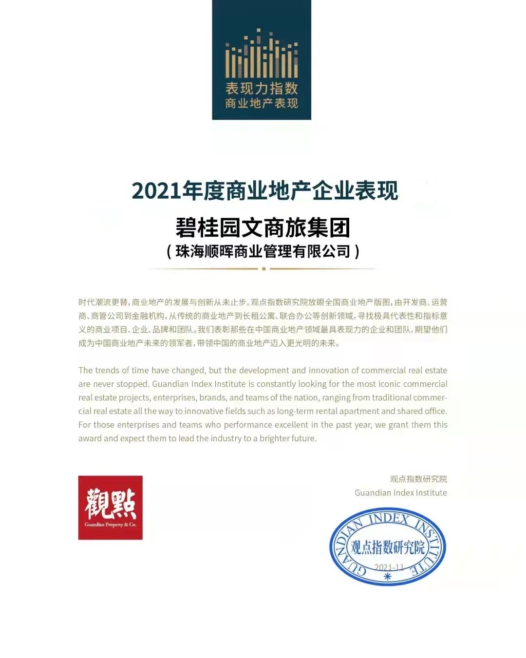碧桂園文商旅集團(tuán)“2021年度商業(yè)地產(chǎn)企業(yè)表現(xiàn)”證書