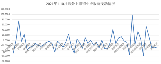 將時(shí)間線拉長(zhǎng)來(lái)看,2021年1月至10月上市物業(yè)服務(wù)企業(yè)股價(jià)漲幅領(lǐng)先的是和泓服務(wù),年內(nèi)漲幅97.63%,其次是中海物業(yè)漲幅74.99%、濱江服務(wù)54.2%。跌幅方面,彩生活年內(nèi)領(lǐng)跌,跌幅達(dá)到59.4%,其次是恒大物業(yè)跌幅55.48%、卓越商企服務(wù)跌幅為48.77%。