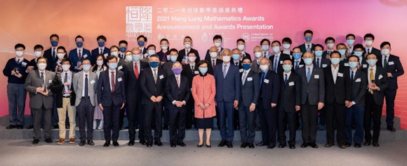 2021年恒隆數(shù)學(xué)獎(jiǎng)各得獎(jiǎng)隊(duì)伍與香港特別行政區(qū)行政長(zhǎng)官林鄭月娥女士、恒隆地產(chǎn)董事長(zhǎng)陳啟宗先生、副董事長(zhǎng)陳文博先生、行政總裁盧韋柏先生、香港科技大學(xué)校長(zhǎng)史維教授,以及2021年恒隆數(shù)學(xué)獎(jiǎng)學(xué)術(shù)委員會(huì)、督導(dǎo)委員會(huì)、執(zhí)行委員會(huì)和初審委員會(huì)的委員合照