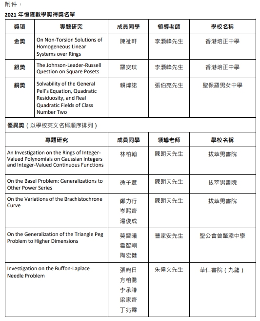 香港培正中學(xué)勇奪2021年恒隆數(shù)學(xué)獎(jiǎng)金獎(jiǎng)及銀獎(jiǎng)殊榮