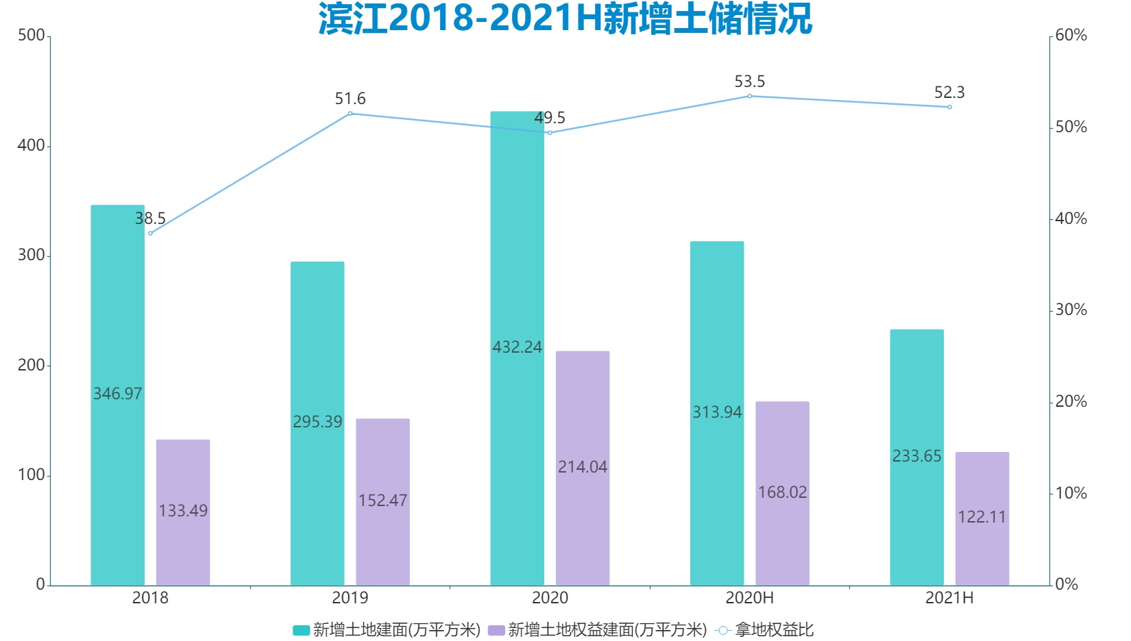 值得注意的是,2018年濱江拿地權益比只有38.5%,從2019年開始則穩(wěn)定在50%左右,2021年上半年拿地權益比為52.3%,這說明濱江有意識地逐漸增加公司拿地權益比例。