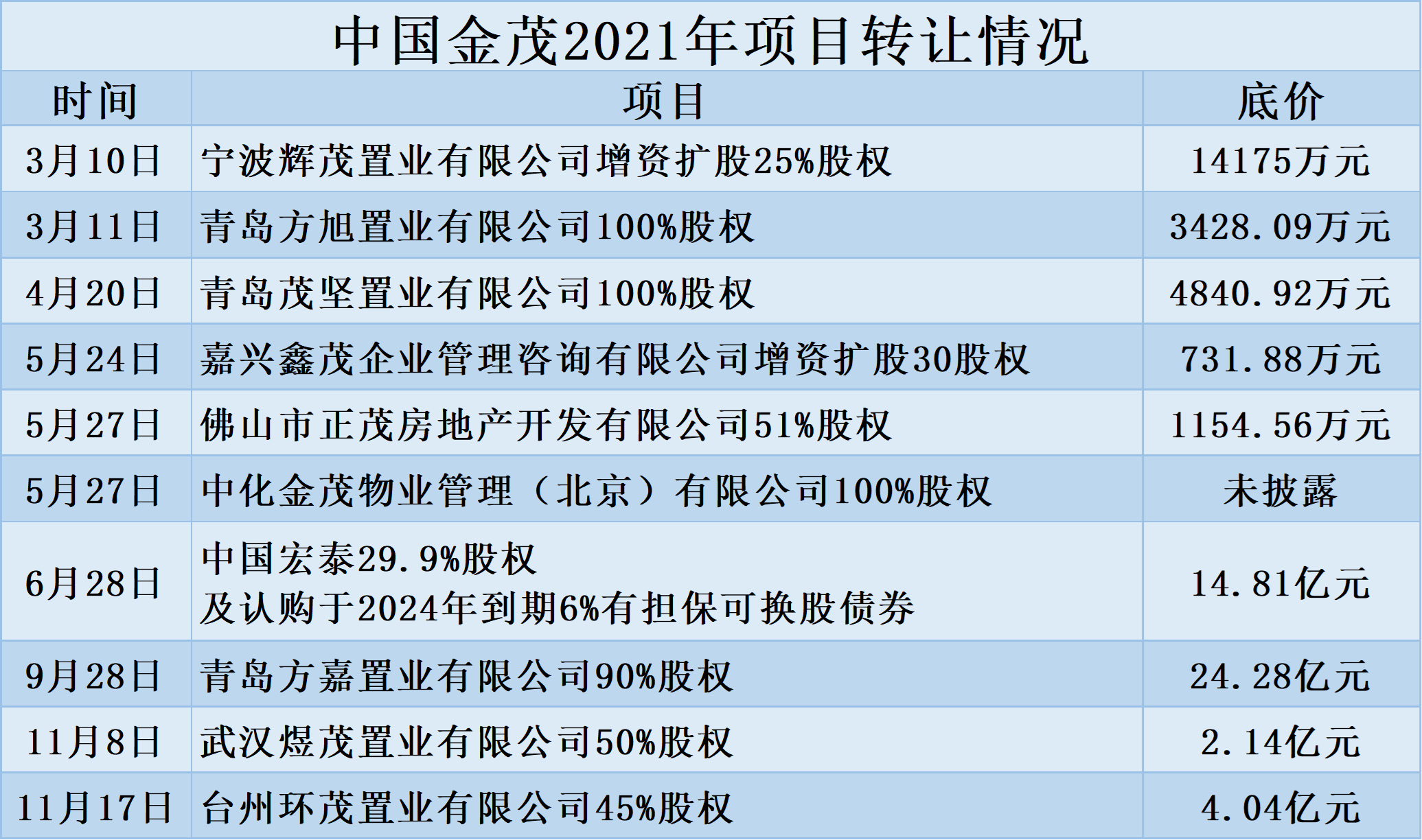 進(jìn)入2021年,據(jù)不完全統(tǒng)計(jì),上半年中國(guó)金茂共出讓不少于10家的公司股權(quán)。最近一次是在11月17日,中國(guó)金茂擬以底價(jià)4.04億元轉(zhuǎn)讓旗下臺(tái)州環(huán)茂置業(yè)有限公司45%股權(quán)。