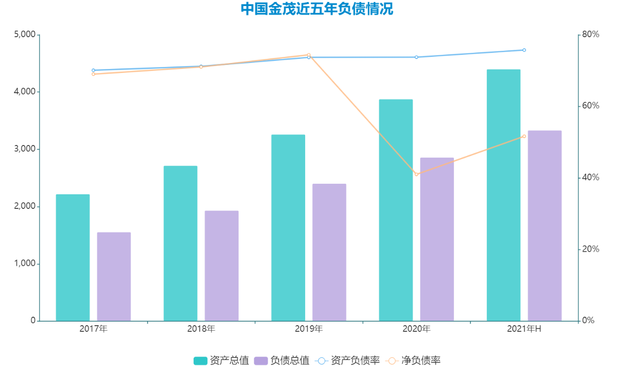 資產(chǎn)負(fù)債方面,截至2020年末,中國(guó)金茂資產(chǎn)總額3877.56億元,負(fù)債總額2859.29億元,整體資產(chǎn)負(fù)債率73.74%。2021年中期,中國(guó)金茂資產(chǎn)總值達(dá)4400.89億元,負(fù)債總額上升至3332.59億元,資產(chǎn)負(fù)債率為75.73%