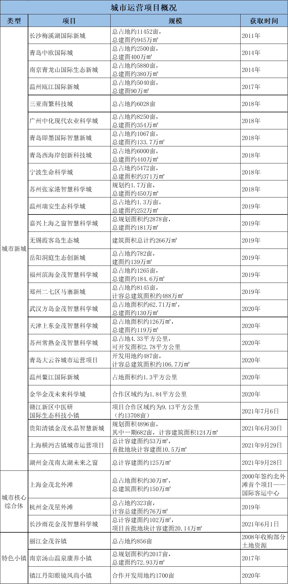 2021年以來(lái),新增貴陽(yáng)清鎮(zhèn)金茂水晶智慧新城、長(zhǎng)沙雅塘創(chuàng)新生態(tài)城、江西贛江新區(qū)中醫(yī)藥國(guó)際生態(tài)科技小鎮(zhèn)、上海浦東新區(qū)橫沔古鎮(zhèn)城中村項(xiàng)目、湖州金茂南太湖未來(lái)之窗等5個(gè)項(xiàng)目。截至12月,中國(guó)金茂的城市運(yùn)營(yíng)項(xiàng)目已達(dá)32個(gè)。