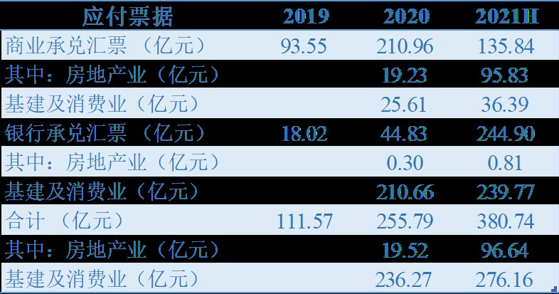 雖然在短期有息負(fù)債有所優(yōu)化,但在資金緊張情況下,商票作為一條較為隱秘的融資渠道,綠地在這方面上也使用不少。商業(yè)承兌匯票總額從2016年的9405.07萬(wàn)上升至2021年上半年的135.84億元,銀行承兌匯票同樣也在2021年上半年達(dá)到239.77億元,兩者合計(jì)380.74億元。
