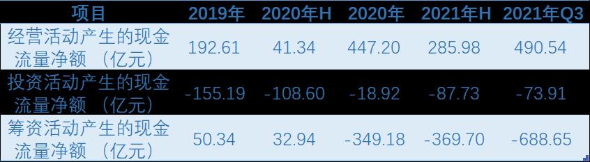 2021年三季報(bào)顯示,綠地籌資活動(dòng)現(xiàn)金流、投資活動(dòng)現(xiàn)金流分別錄得-688.65億元、-73.91億元,同比分別減少4177.26%、53.22%。