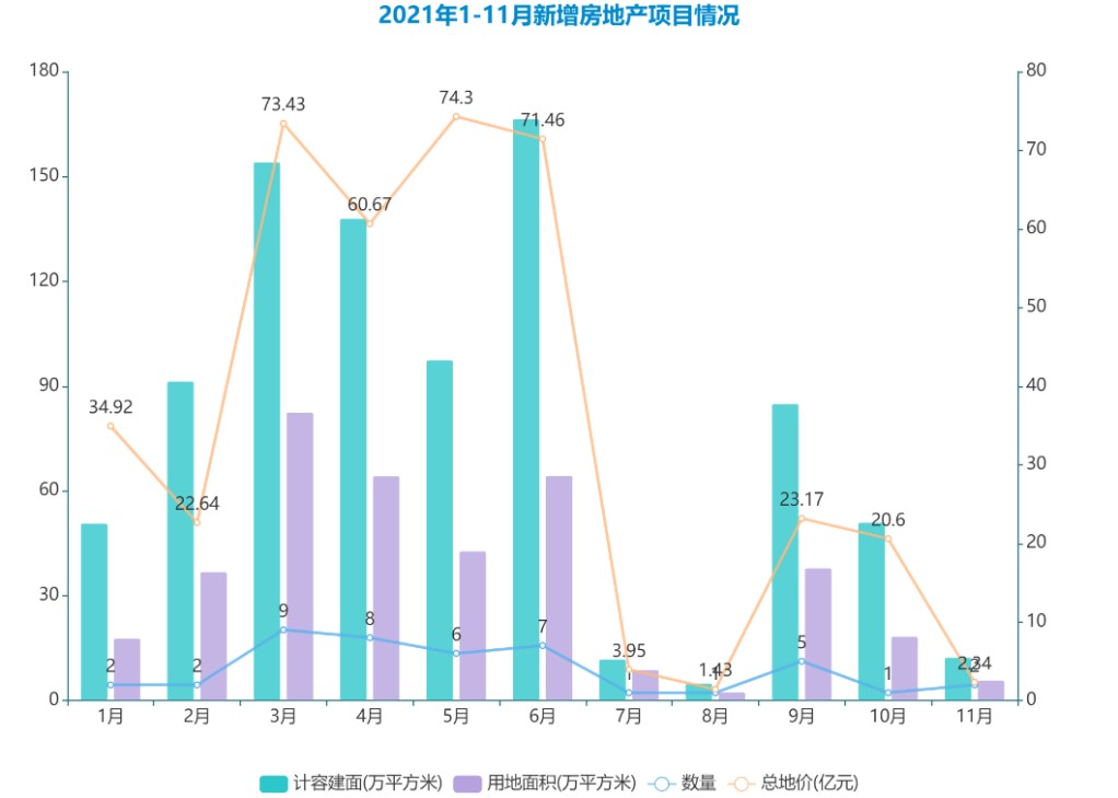 下半年受市場(chǎng)調(diào)整和房企拿地意愿降低影響,土地市場(chǎng)呈現(xiàn)疲軟狀態(tài),第二批集中供地成交規(guī)模和土地出讓金均較首批降低近四成,但綠地并沒(méi)有過(guò)多參與,7、8、11三個(gè)月新增房地產(chǎn)項(xiàng)目總地價(jià)均為個(gè)位數(shù),這種情況實(shí)屬罕見(jiàn)。