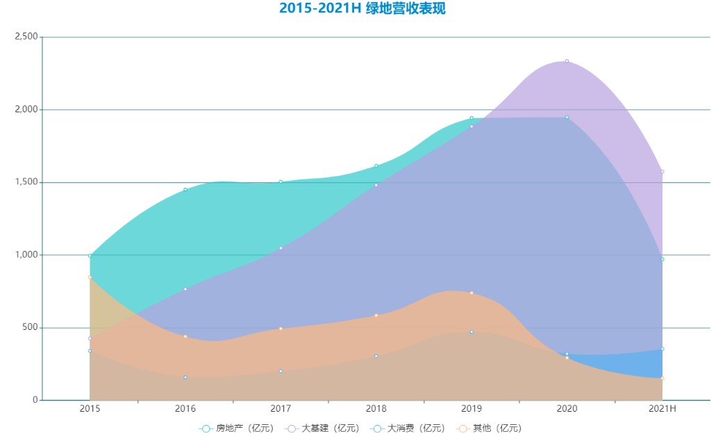 從2020年三季度開(kāi)始基建營(yíng)業(yè)收入已反超房地產(chǎn)營(yíng)業(yè)收入,之間營(yíng)收的差距進(jìn)一步擴(kuò)大;2020年報(bào)、2021半年報(bào)的數(shù)據(jù)變化,基建營(yíng)業(yè)收入占比連續(xù)達(dá)到50%,也宣告綠地正式完成房地產(chǎn)到基建行業(yè)的轉(zhuǎn)身,基建也準(zhǔn)備挑起其的“大梁”。