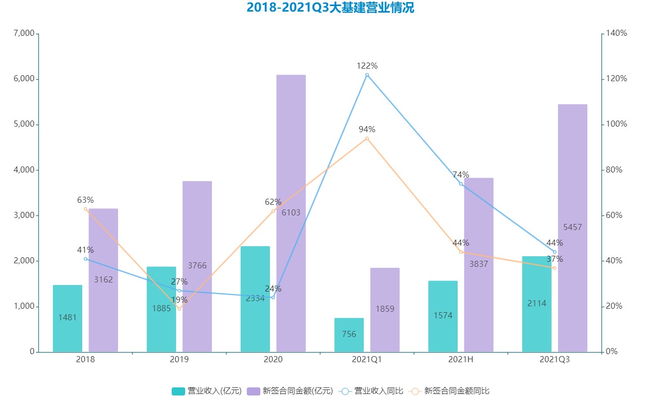 2021年,綠地大基建增長(zhǎng)較為顯著,上半年度營(yíng)業(yè)收入1574億元,同比增長(zhǎng)74%,新簽合同金額3837億元,同比增長(zhǎng)迅猛達(dá)44%,中標(biāo)10億元以上重大項(xiàng)目42個(gè),包括100億級(jí)項(xiàng)目2個(gè)、50億級(jí)項(xiàng)目2個(gè);三季度營(yíng)業(yè)收入2114億元,同比增長(zhǎng)有所下滑至44%。