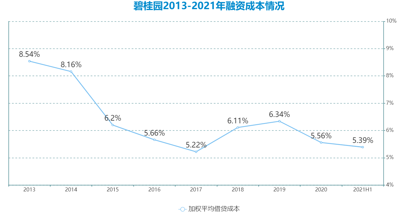 截至2021年中期,碧桂園整體融資成本下降至5.39%,較2020年末降低0.17個(gè)百分點(diǎn)。