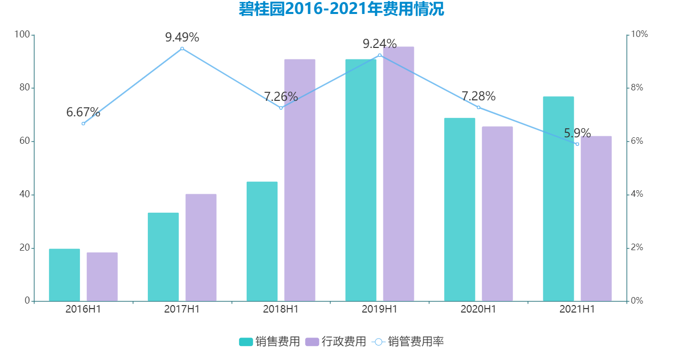 2021年上半年,碧桂園銷管費(fèi)用率下探到5.9%的水平,相比前兩年已有不小回落。