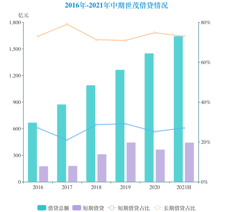 即使如此,世茂賬面上看現(xiàn)金依舊完全覆蓋短期債務(wù),有息負(fù)債規(guī)模雖呈逐漸上升態(tài)勢,但長短債比一直維持在較穩(wěn)定水平。2021年上半年,世茂有息負(fù)債規(guī)模為1645.1億元,其中短債444.43億元,占比27%。