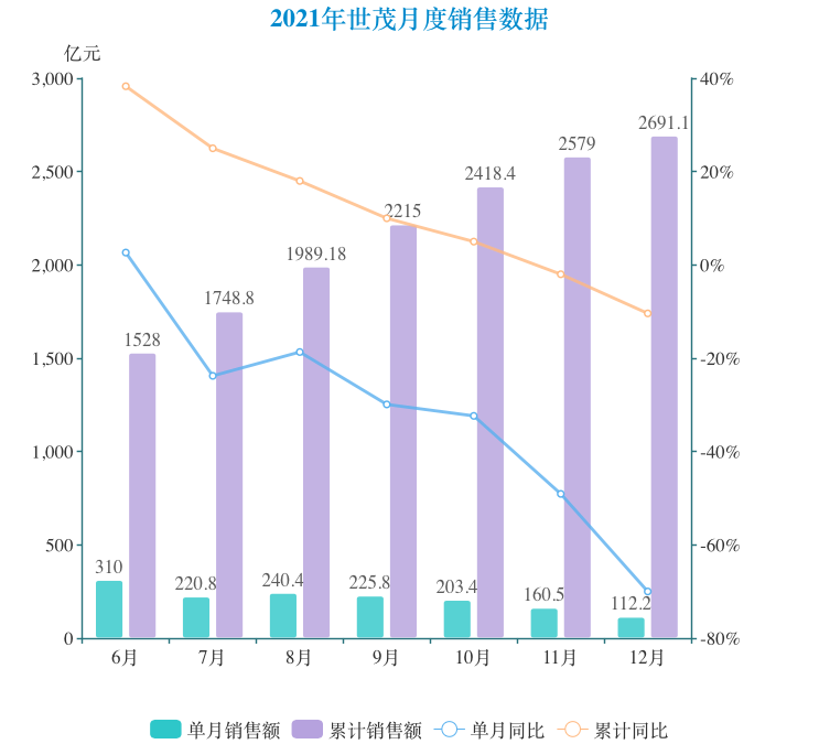 根據(jù)全年業(yè)績公告,截至2021年12月31日止,世茂集團(tuán)累計(jì)合約銷售總額約為人民幣2691.1億元,同比下降10.39%。
