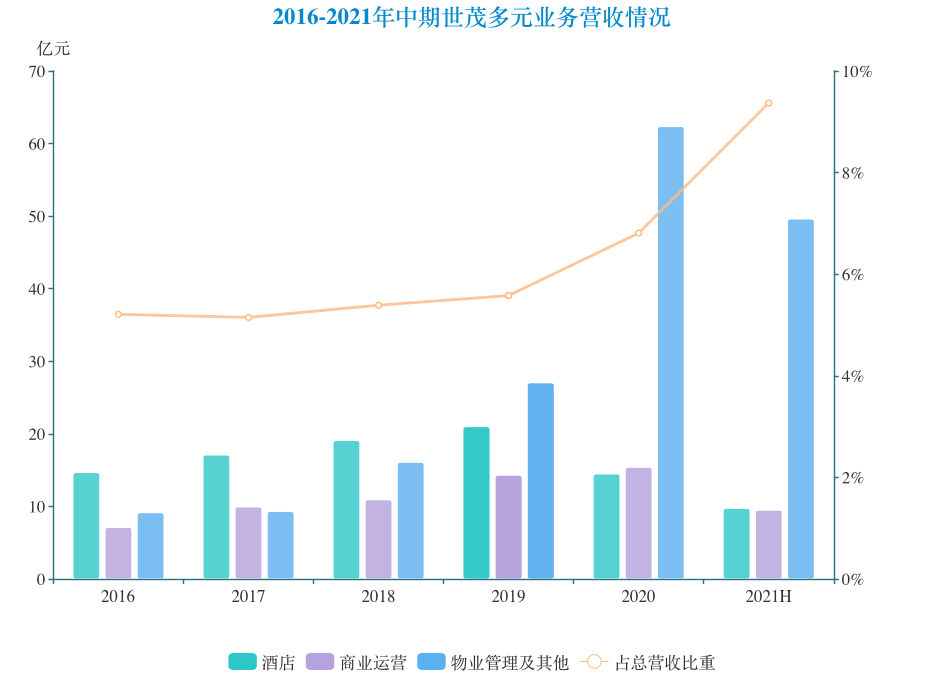 2021年上半年,世茂非房開業(yè)務(wù)實(shí)現(xiàn)收入68.8億元,同比增長123%,占總收入比例達(dá)到9%。其中,酒店經(jīng)營收入由2020年同期4.53億元增加約114.6%至9.72億元;商業(yè)運(yùn)營收入為9.47億元,同比增加29.0%;物業(yè)管理收入及其他為49.61億元,同比上升約161.1%。