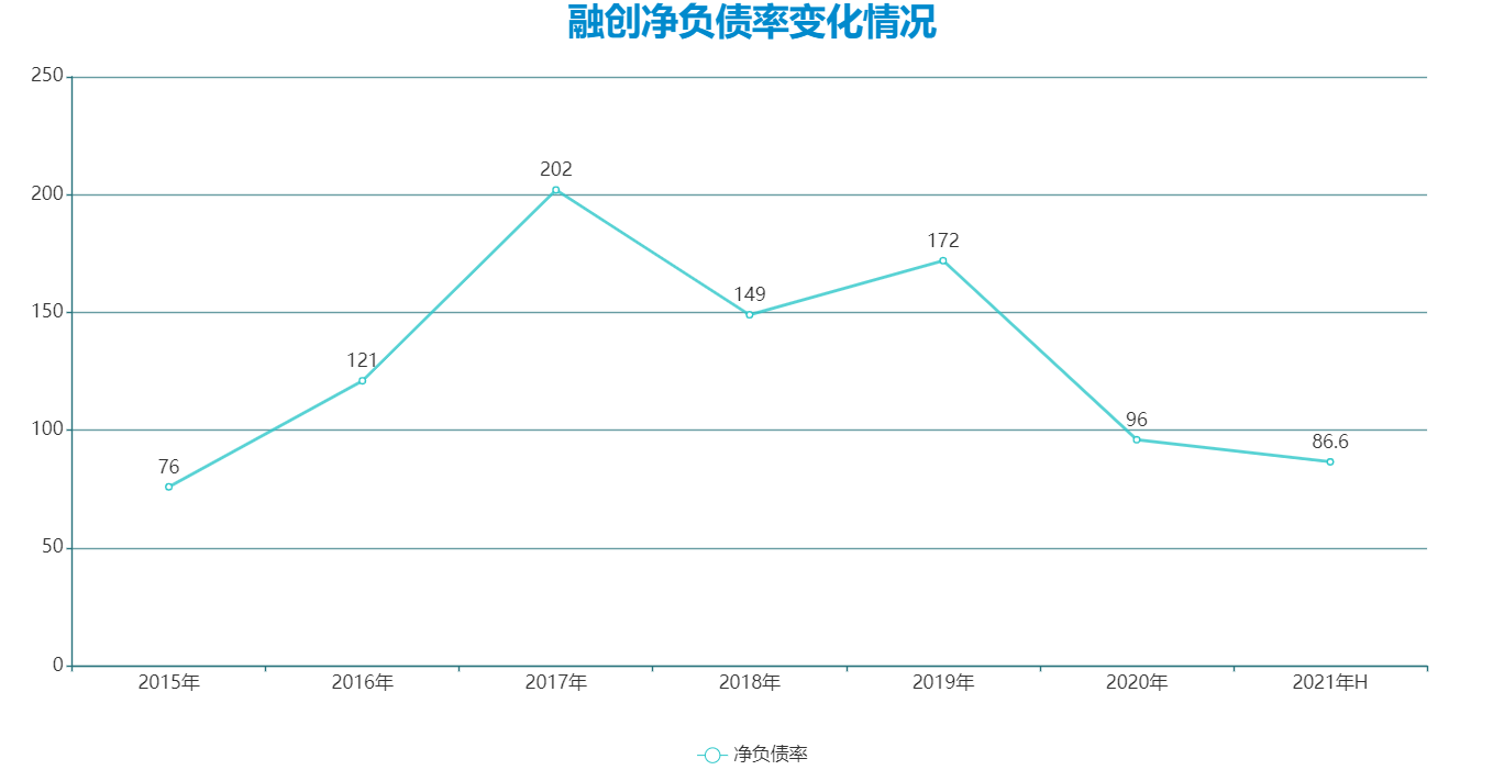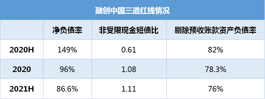 至2021年中期,融創(chuàng)凈負債率約為86.6%,非受限現(xiàn)金短債比約為1.11,剔除預收賬款后的資產(chǎn)負債率約為76%。