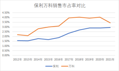 從市場占有率觀察,2018-2020年保利發(fā)展分別達(dá)成3092億元、4048億元及5028.48億元銷售,對應(yīng)市占率由2.70%逐步升至2.90%;相比之下,行業(yè)“老大哥”萬科近三年市占率基本維持4%左右。