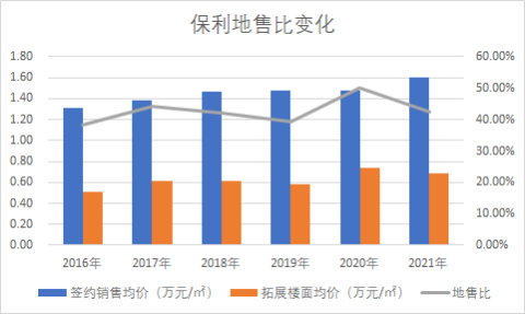 拓展成本看,保利發(fā)展新增土地成本從2016年每平方米5050元升至2020年的7388元,疊加新房限價影響,新增土地成本占同期銷售均價比例從38.43%升至50.09%;2021年拓展成本有所降至約6800元,但仍占銷售均價的42.5%。