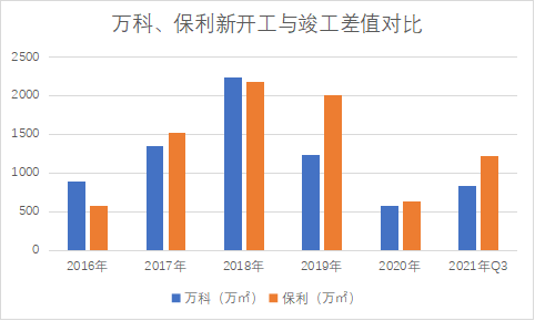 這也顯示出兩家企業(yè)發(fā)展戰(zhàn)略的不同:保利在年度股東會上曾預(yù)判“十四五”是重要的戰(zhàn)略機遇期,抓住窗口發(fā)展是主要任務(wù);萬科則早早已預(yù)判行業(yè)面臨拐點,實施業(yè)務(wù)聚焦及縮表策略,并聚焦于竣工回款。因此,在新開工面積與竣工面積差額上差異也較大。