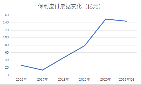 保利發(fā)展在商業(yè)票據(jù)上的使用力度也有所提高,公司應(yīng)付票據(jù)從2016年26億元提高至2020年149.19億元,至2021年上半年達(dá)173.72億元,主要由于開具商業(yè)票據(jù)增加。不過,三季度起恒大商票爆發(fā)風(fēng)險,這期間保利亦縮減了商票,使應(yīng)付票據(jù)降至143.5億元。