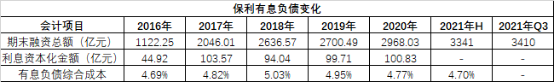 財務(wù)加杠桿使得保利的有息負(fù)債由2020年底2968.03億元增加至三季末的3410億元;但有息負(fù)債/銷售金額比率為83%,較上年末提高24個點,資金使用效益比例維持高位。同時,上半年有息負(fù)債綜合成本約4.7%,較上年末下降7個基點,依然保持領(lǐng)先優(yōu)勢。