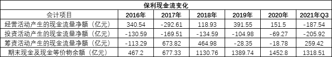 而現(xiàn)金流量來看,保利發(fā)展2021年經(jīng)營活動產(chǎn)生的現(xiàn)金流量凈額持續(xù)為負(fù),至三季度末為-187.54億元。這主要由于銷售回籠增加的同時,購買商品、接受勞務(wù)支付現(xiàn)金,以及合作項目往來款也都在增加。