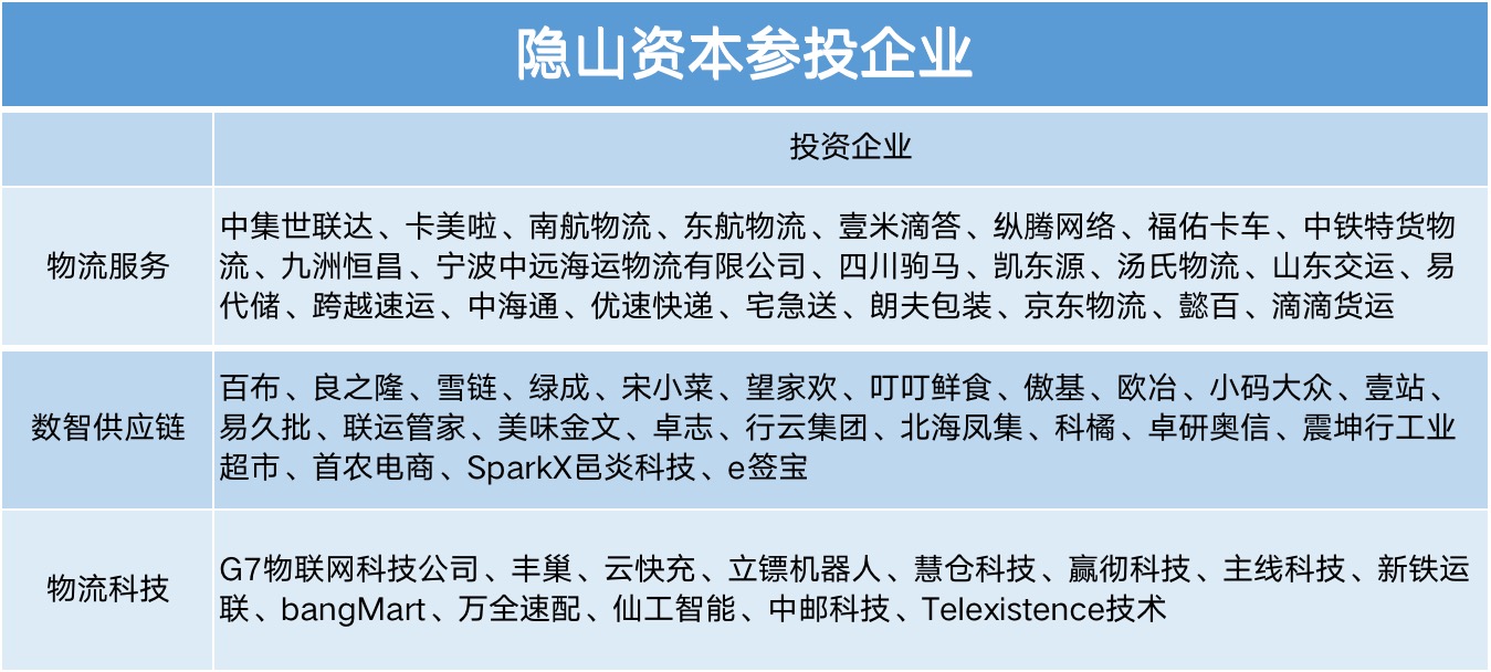 根據(jù)官網(wǎng)數(shù)據(jù),隱山資本主要關(guān)注物流服務(wù)、數(shù)智供應(yīng)鏈、物流科技等領(lǐng)域。