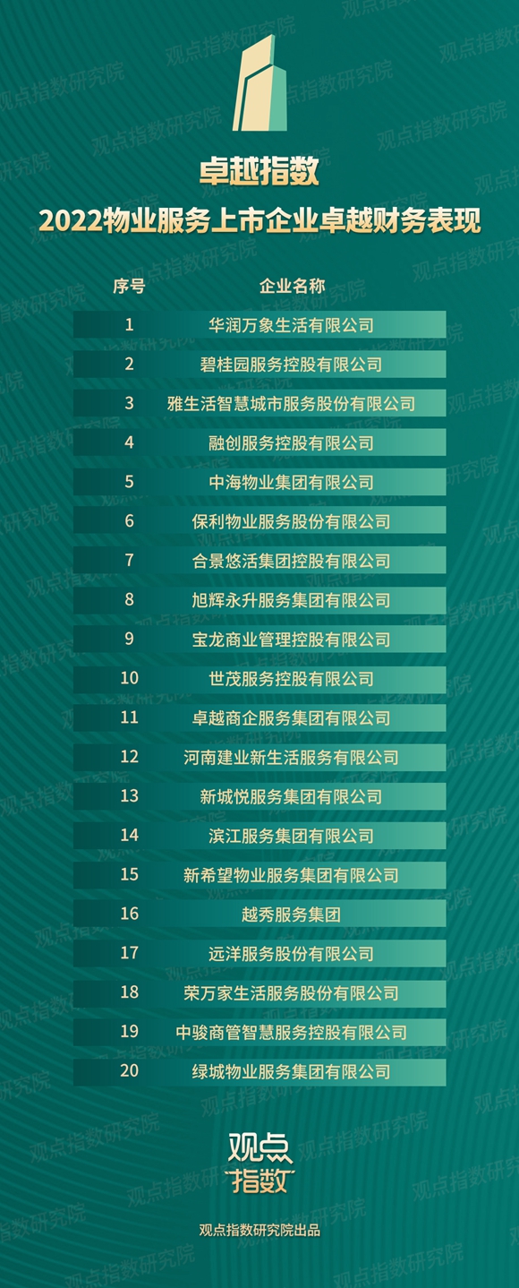 經(jīng)過(guò)嚴(yán)謹(jǐn)分析、對(duì)企業(yè)財(cái)務(wù)和經(jīng)營(yíng)質(zhì)量進(jìn)行綜合評(píng)判,觀點(diǎn)指數(shù)發(fā)布“2022物業(yè)服務(wù)上市企業(yè)卓越財(cái)務(wù)表現(xiàn)”研究成果。最終有20家企業(yè)脫穎而出,以研究成果來(lái)看,華潤(rùn)萬(wàn)象生活屹立前列,而碧桂園服務(wù)與雅生活集團(tuán)緊隨其后。