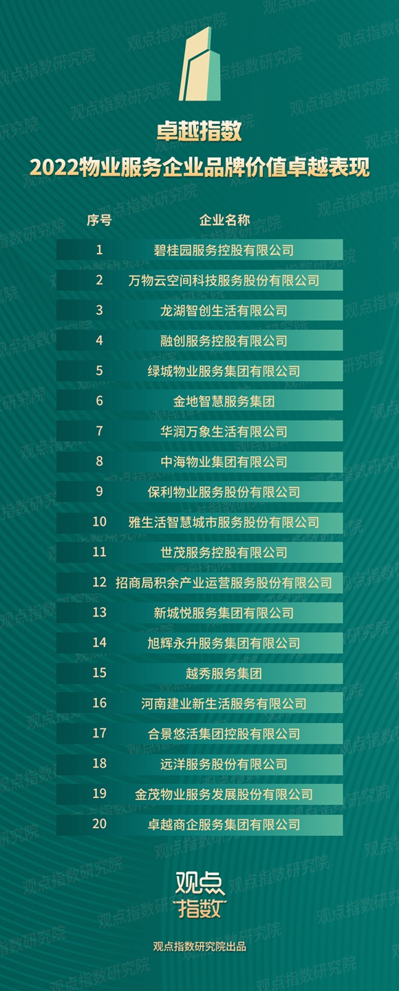 “2022物業(yè)服務(wù)企業(yè)品牌價(jià)值卓越表現(xiàn)”,基于觀點(diǎn)指數(shù)對(duì)在營(yíng)物業(yè)服務(wù)企業(yè)進(jìn)行大量和長(zhǎng)期的調(diào)查研究,從環(huán)境、社會(huì)和公司治理(ESG)、策劃推廣、行業(yè)影響力等多個(gè)維度進(jìn)行綜合評(píng)析,旨在集中展現(xiàn)過(guò)去一年打造了優(yōu)秀品牌價(jià)值與知名度的物業(yè)服務(wù)企業(yè)。