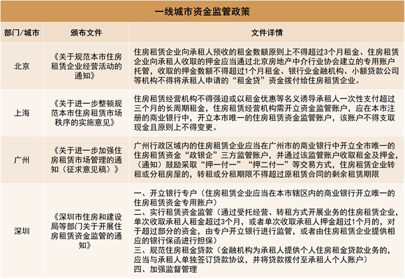 四個一線城市資金監(jiān)管文件中均提出,需要在當(dāng)?shù)亻_設(shè)資金監(jiān)管賬戶,實行租賃資金監(jiān)管,商業(yè)銀行成為住房租賃資金監(jiān)管的有效平臺。