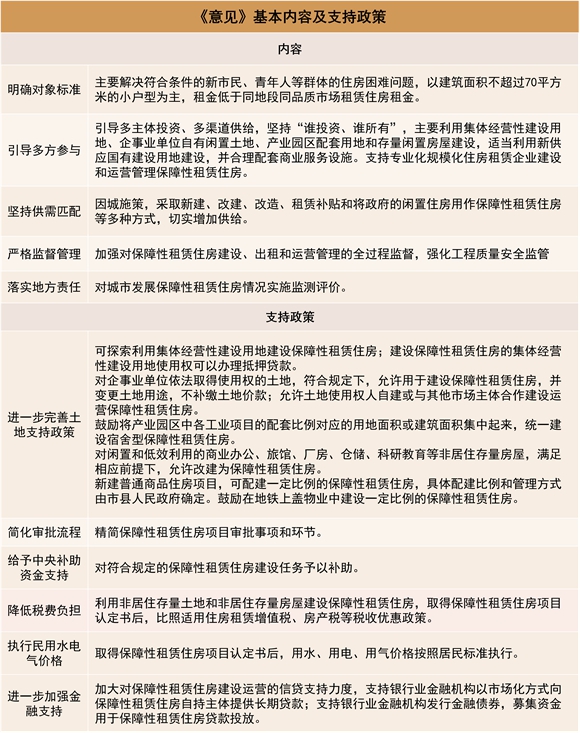 2021年7月,國務(wù)院頒布的《關(guān)于加快發(fā)展保障性租賃住房的發(fā)展意見》,其中明確保障性租賃住房對象是城市青年人群,緩解城市住房壓力。文件主要從租賃用地供給、稅收優(yōu)惠、資金支持、金融支持等多方面做出指導(dǎo)意見。