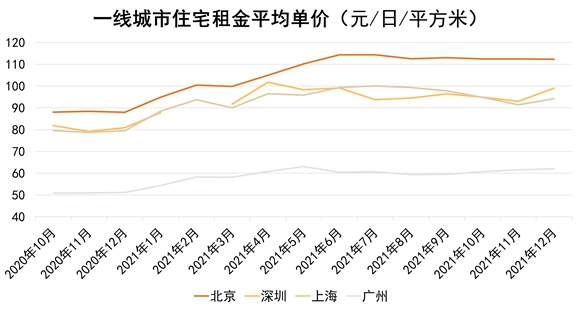 一線城市中北京住宅租金平均單價始終位于首位,2021年12月北京租金單價達到112.3元/日/平方米。