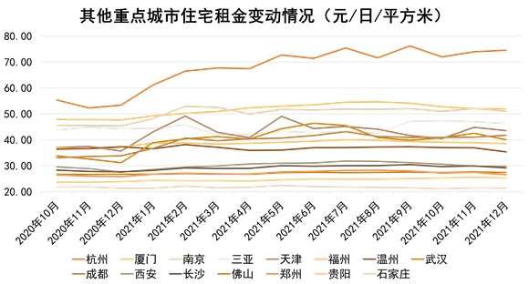 其他重點城市租金大多數(shù)呈現(xiàn)平穩(wěn)趨勢,其中杭州租金走勢從2021年4月以來呈現(xiàn)波動上升走勢。此外,其12月住宅租金單價為74.55元/日/平方米,1月份為61.13元/日/平方米,年內(nèi)住宅租金單價實現(xiàn)大幅提升,漲幅達21.95%。