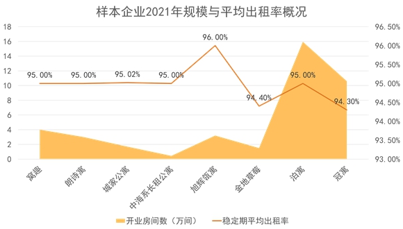 從2021年企業(yè)整體出租率情況來看,租賃企業(yè)穩(wěn)步前行,樣本企業(yè)整體平均出租率達94.97%。其中城家、旭輝瓴寓、中海系長租公寓等多個租賃企業(yè)2021年整體出租率超95%,企業(yè)運營情況整體向好。