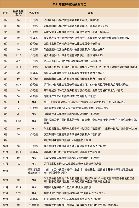 從金融端動態(tài)來看,2021年住房租賃專項公司債券受國企、央企以及行業(yè)頭部房企的青睞,如萬科、華潤置地、保利地產(chǎn)等房企積極發(fā)行住房租賃專項公司債券,募集資金多數(shù)擬用于建設(shè)住房租賃項目,住房租賃專項公司債成為房企融資的重要渠道。