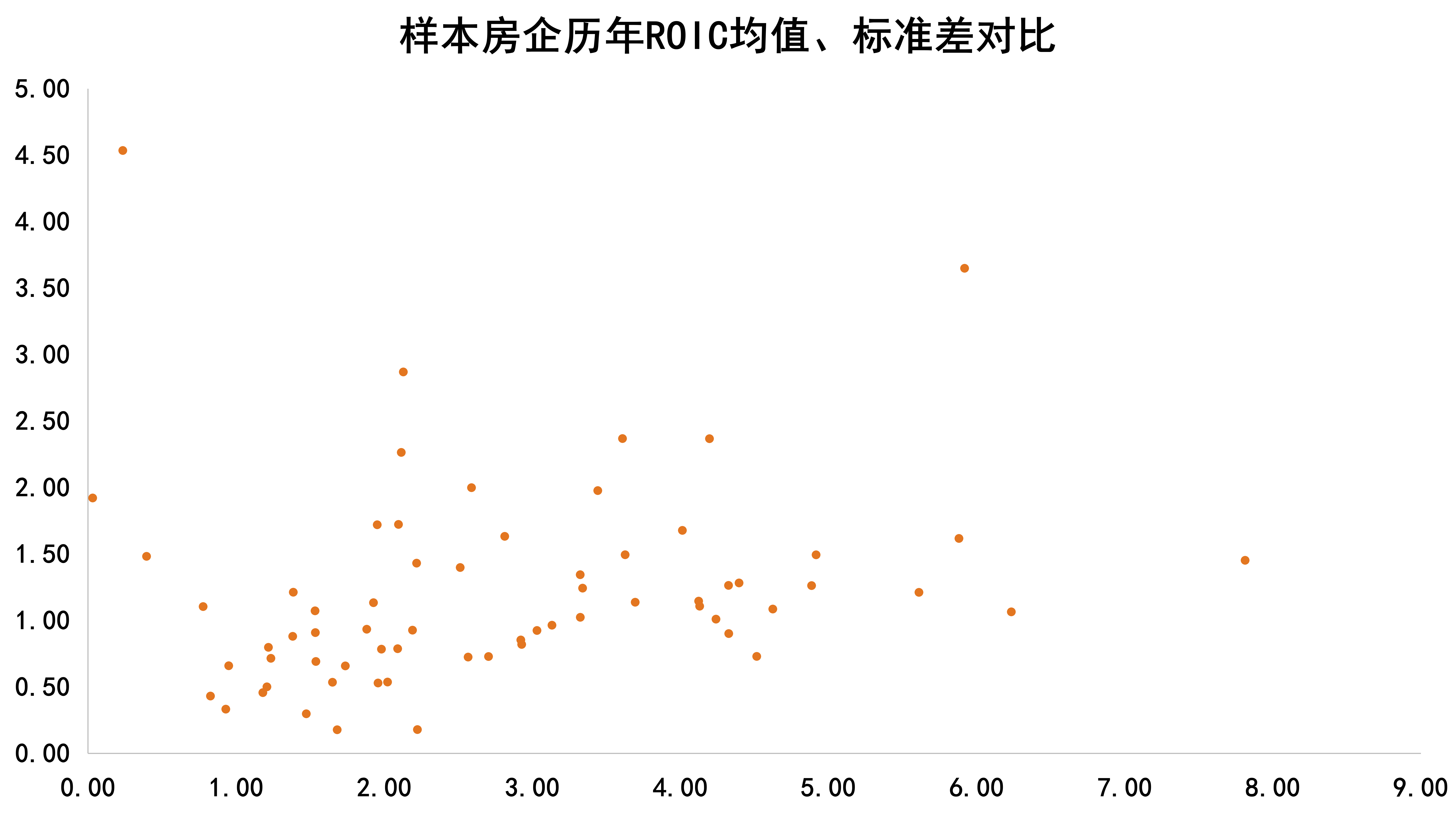若將企業(yè)資金渠道擴(kuò)大,考慮企業(yè)加杠桿進(jìn)行周轉(zhuǎn)運(yùn)營的情況,即上市企業(yè)凈利潤與投入資本的比值(ROIC),可以看到過去6年各家房企ROIC指標(biāo)標(biāo)準(zhǔn)差多處于0.5-1.5之間,ROA整體水平基本保持穩(wěn)定。