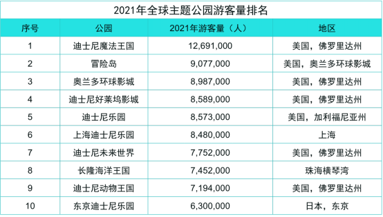 《2021全球主題公園和博物館報(bào)告》顯示,在TOP25主題公園榜單中,客流量位于榜首的是美國(guó)佛羅里達(dá)州迪士尼魔法王國(guó),2021年客流量達(dá)到1269萬(wàn)人。值得注意的是,環(huán)球影城有兩個(gè)主題公園超過(guò)迪士尼其他三個(gè)樂(lè)園游客量。