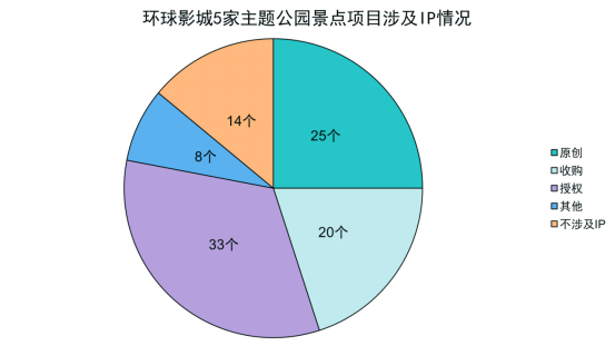 據(jù)長(zhǎng)城證券統(tǒng)計(jì),環(huán)球影城自持和合資的包括奧蘭多冒險(xiǎn)島在內(nèi)的5家主題公園100項(xiàng)景點(diǎn)和游樂(lè)設(shè)施、表演及娛樂(lè)項(xiàng)目,涉及電影IP的達(dá)86項(xiàng),其中33項(xiàng)來(lái)自授權(quán)IP,如哈利波特、漫威、辛普森等,25項(xiàng)來(lái)自環(huán)球影業(yè)及NBC的原創(chuàng)IP,20項(xiàng)來(lái)自收購(gòu)IP,即來(lái)自夢(mèng)工廠及照明娛樂(lè),8項(xiàng)同時(shí)涉及多個(gè)IP。