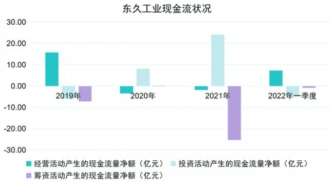2022年一季度,東久實(shí)現(xiàn)經(jīng)營活動(dòng)現(xiàn)金流量凈額為7.22億元,實(shí)現(xiàn)投資活動(dòng)產(chǎn)生的現(xiàn)金流量凈額為-4.80億元,實(shí)現(xiàn)籌資活動(dòng)產(chǎn)生的現(xiàn)金流量凈額為-0.85億元。流出現(xiàn)金除了用于分配股利、利潤或償付利息外,主要用于新增的各類型投資,達(dá)到4.35億元。