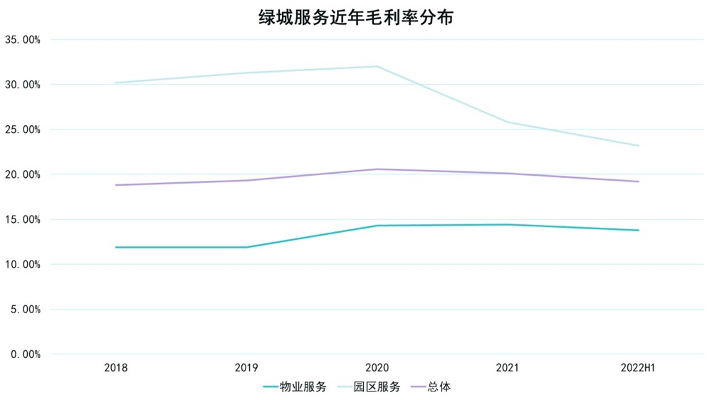 社區(qū)增值服務(wù)通常被認為是拉高物業(yè)公司利潤率的引擎所在,行業(yè)其他物企的該業(yè)務(wù)利潤率普遍在50%以上,而綠城服務(wù)園區(qū)服務(wù)毛利率僅為23%左右。