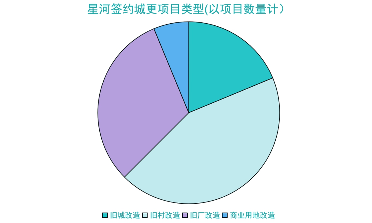 目前星河簽約項目中舊村改造比例為44%,其次是舊廠改造,比例為31%,而舊城改造和商業(yè)用地改造占比分別為19%和6%。