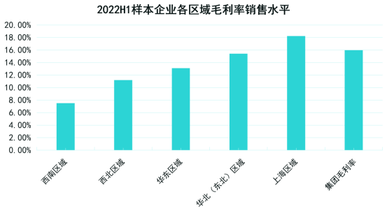 最新數(shù)據(jù)顯示,2022上半年61家樣本企業(yè)平均毛利率水平為15.96%,若剝離其中的“商業(yè)”、“園區(qū)”等板塊收入,毛利率水平甚至低于14%。其中,杭州區(qū)域(圖中上海區(qū)域)的綜合毛利率明顯高于均值,因此“深耕”該區(qū)域的企業(yè)毛利率水平更有機(jī)會(huì)處于行業(yè)平均水平之上(例如,濱江集團(tuán)毛利率19.46%)。