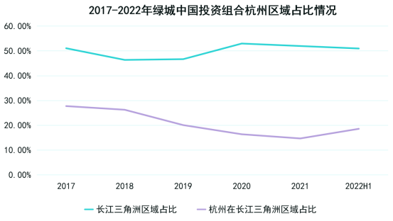 從近六年數(shù)據(jù)看,綠城中國在長(zhǎng)江三角洲的投資組合占比維持在50%水平,并且有緩慢提速趨勢(shì)。
