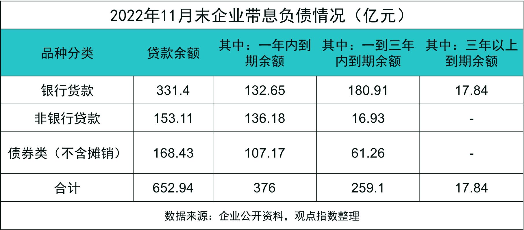 截至2022年11月末,金科披露帶息負(fù)債規(guī)模約653億元,其中一年內(nèi)到期余額中銀行貸款133億元,非銀行金融機(jī)構(gòu)貸款136億元。