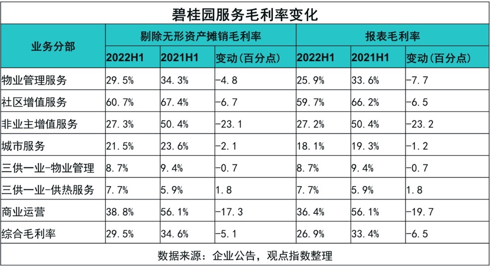 2022年上半年,碧桂園服務(wù)毛利率同比下跌6.5個(gè)百分點(diǎn)至26.9%,且各大業(yè)務(wù)板塊均出現(xiàn)了利潤(rùn)率下滑的現(xiàn)象。